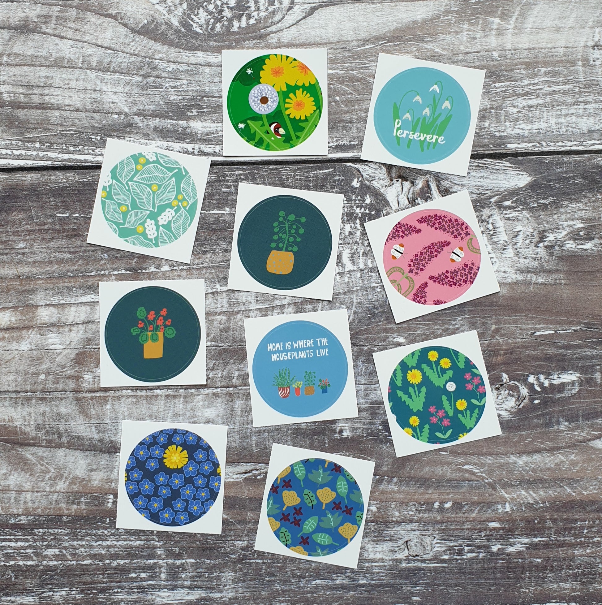 Gorgeously thick and shiny 38mm (3.8cm or 1.49 inches) round vinyl stickers, hand-designed by Daffodowndilly in Shropshire and printed in the UK.