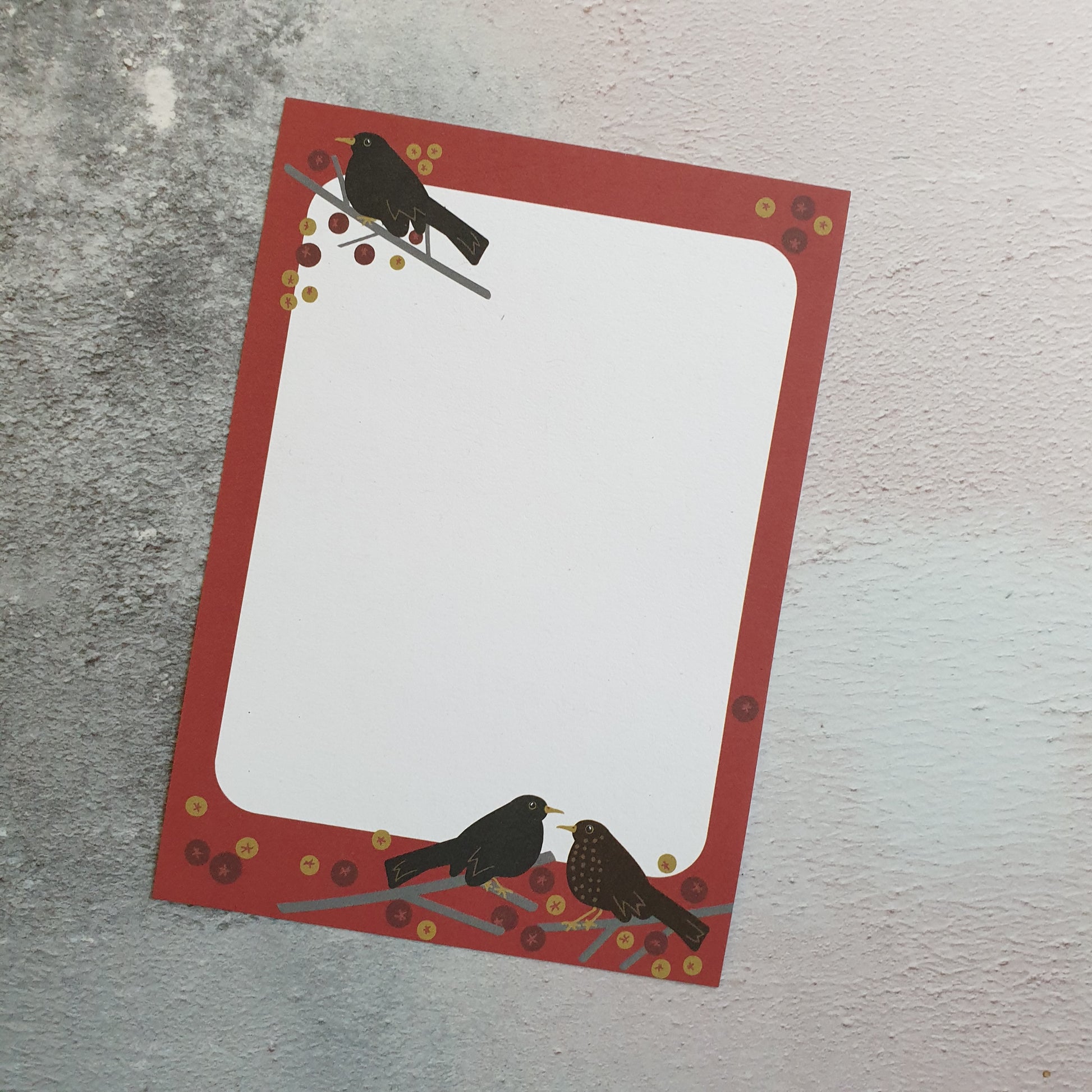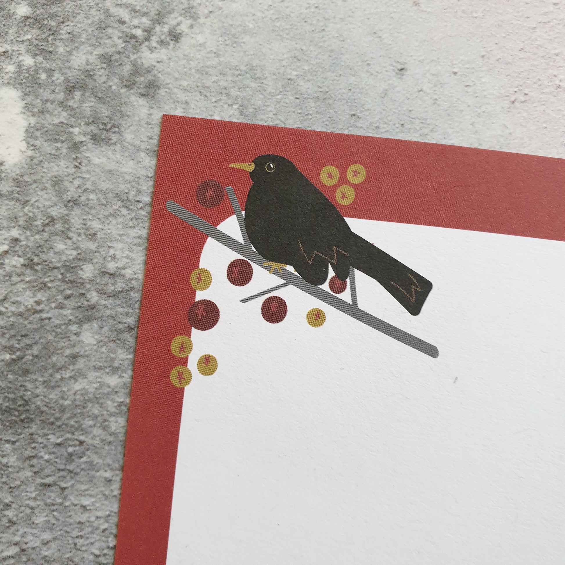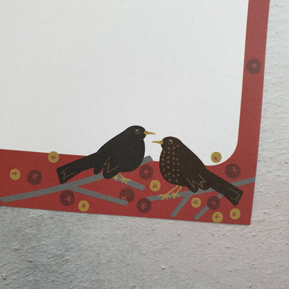 This set features 3 blackbirds surrounded and berries and perched on twigs with a rich red background.