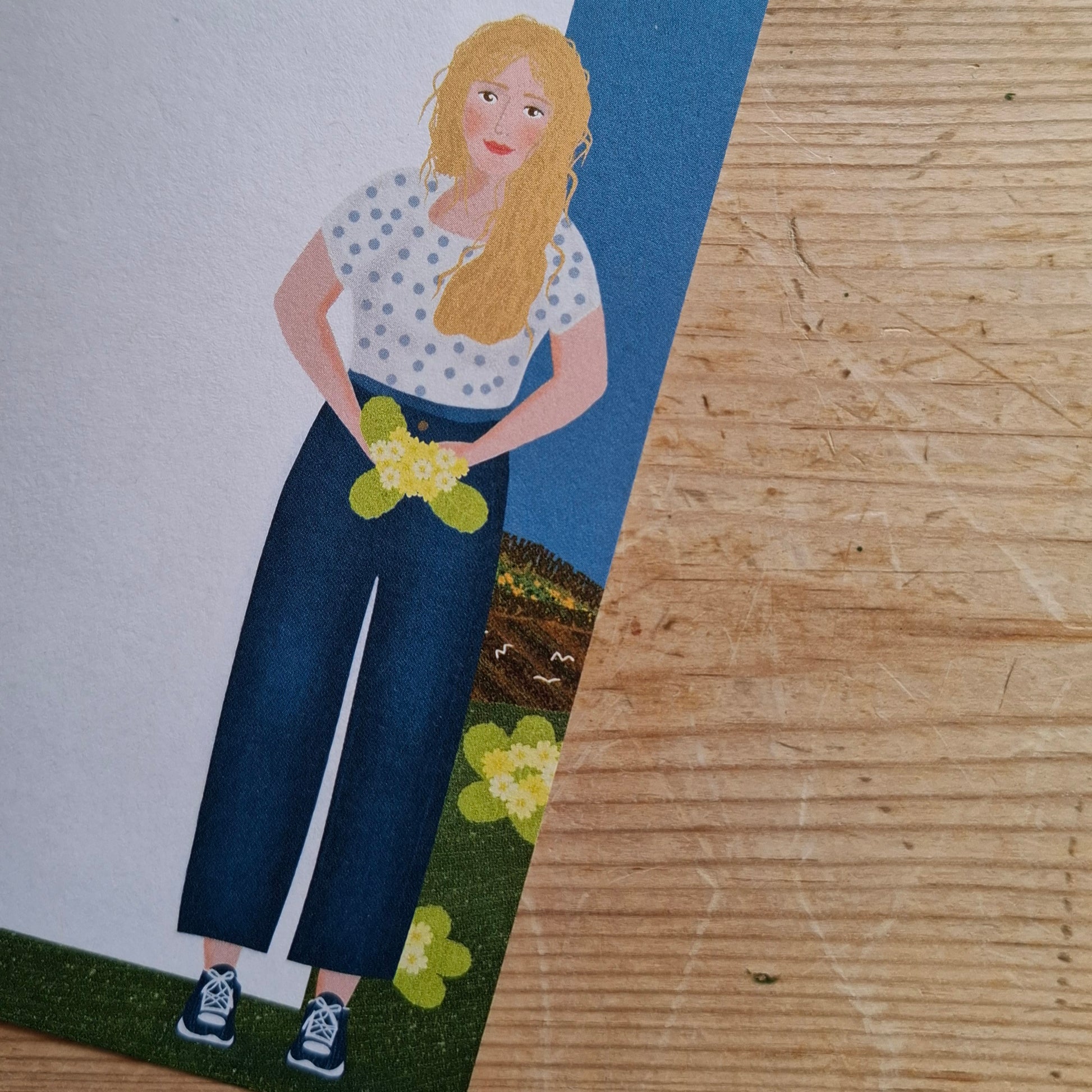 This set features 4 sheets, all with the same design of a Spring landscape and a lady picking primroses, illustrated by Becky.