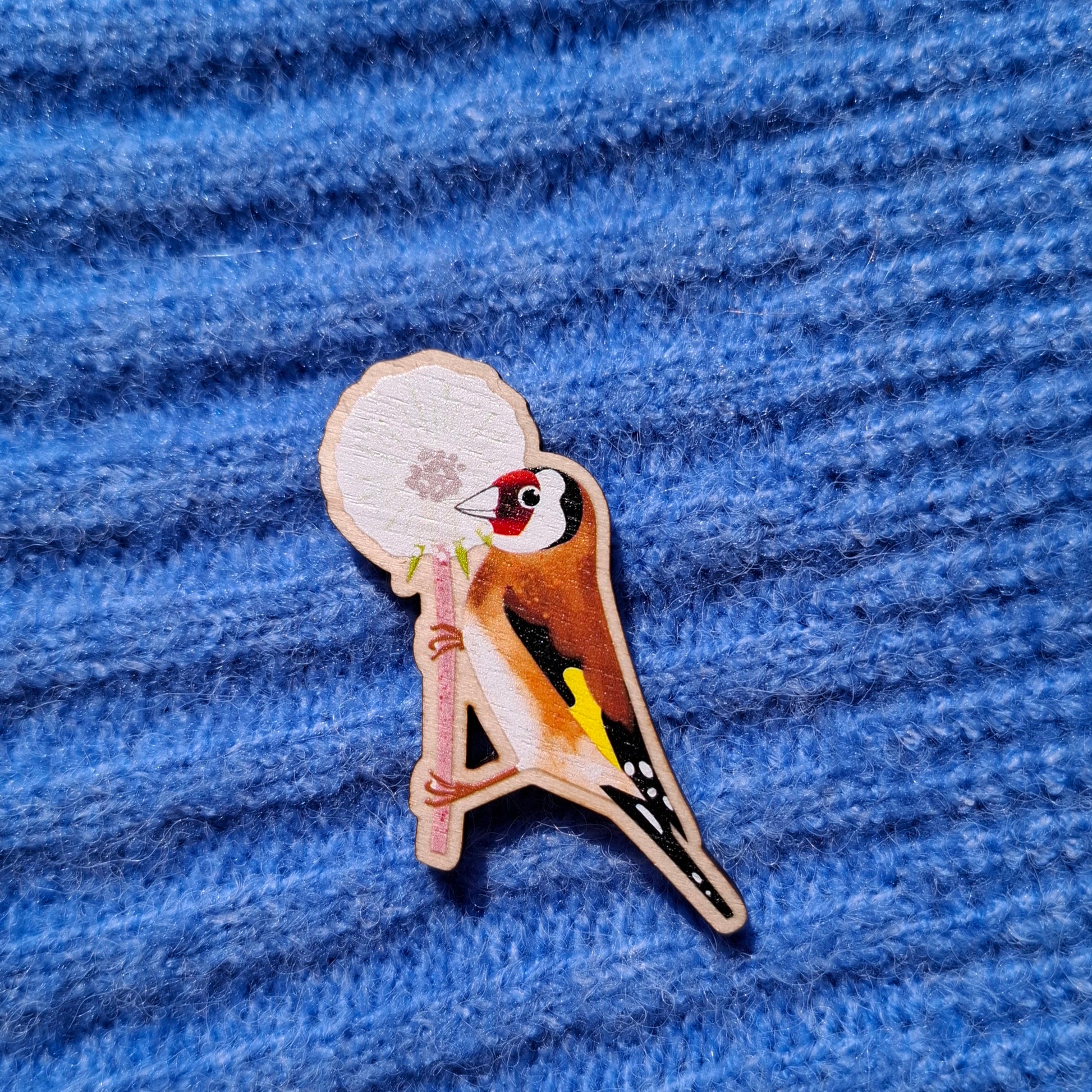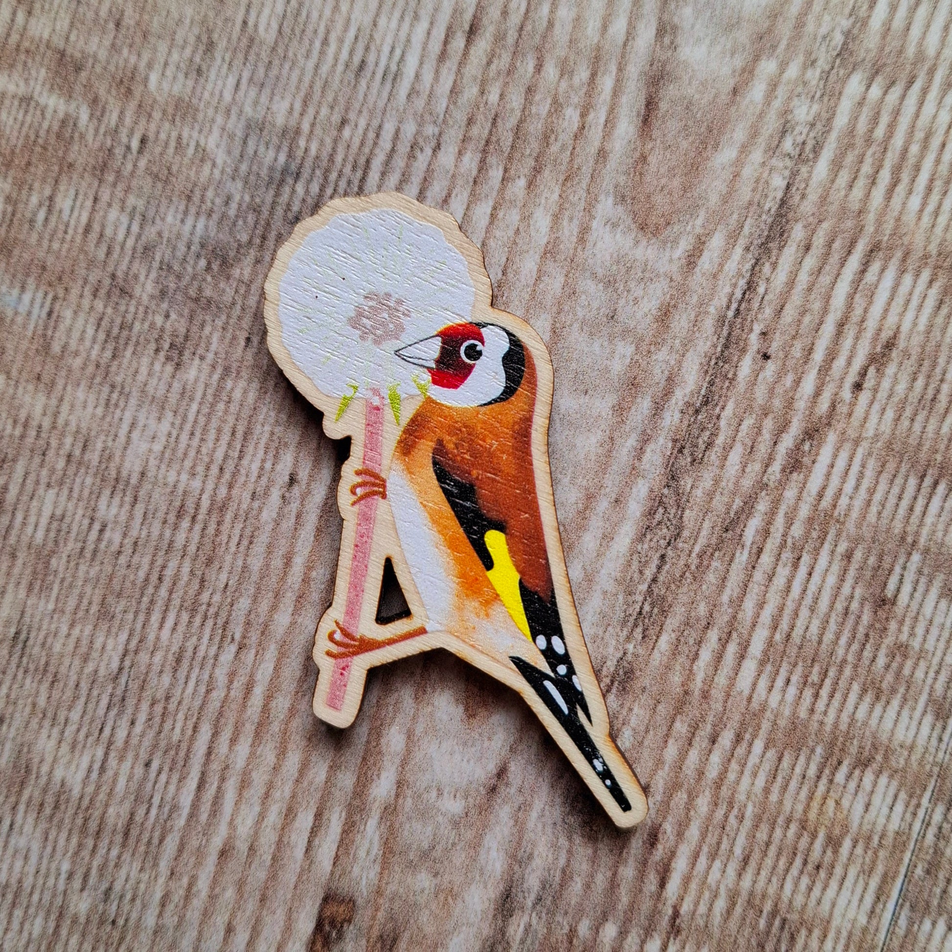 My Goldfinch and dandelion wooden pin has been made in Gloucestershire by a lovely company to my original design of a goldfinch perched on a dandelion seed head. I then attach the pin back and make it into a lapel pin.