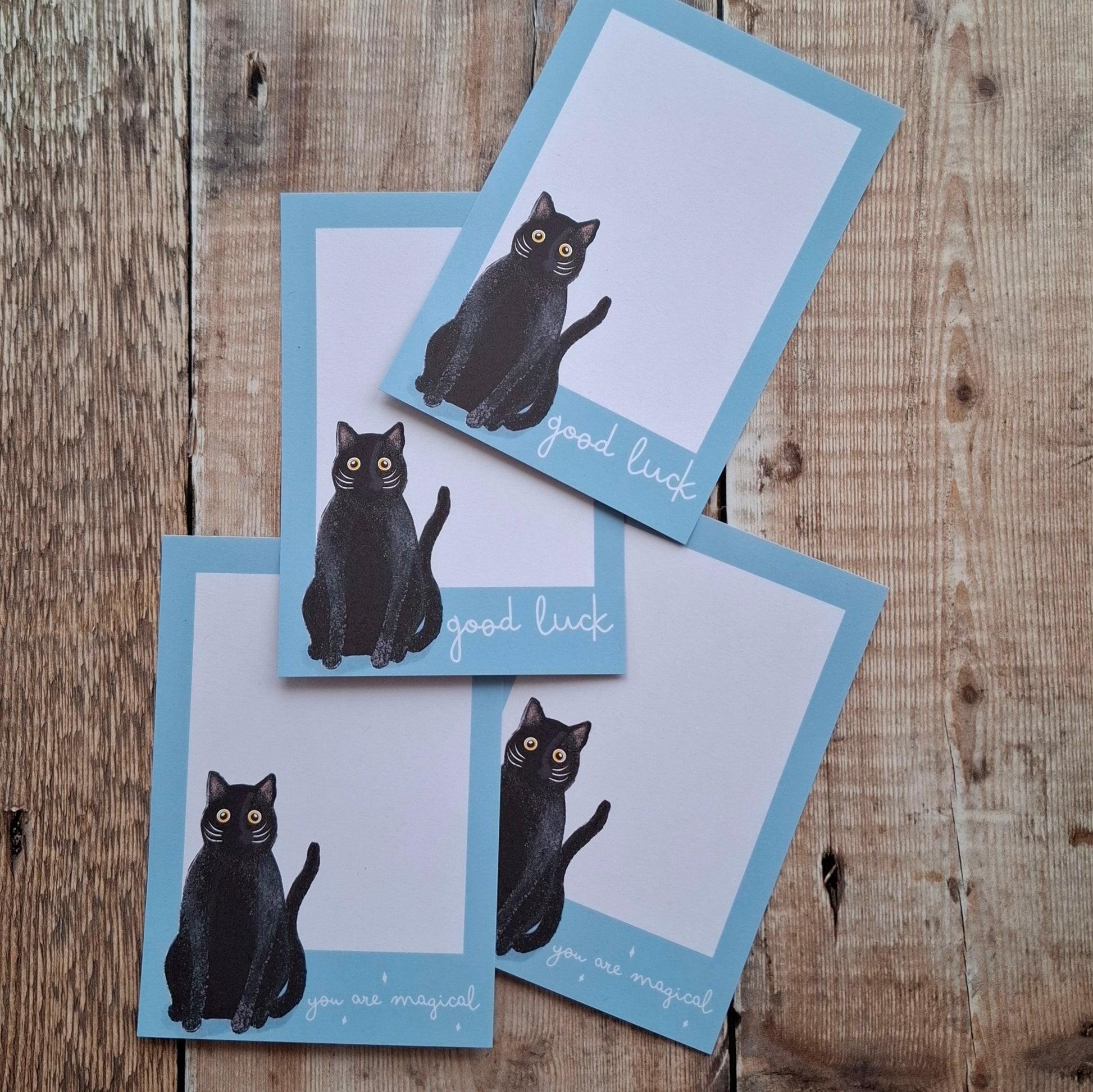 This set features 4 sheets, 2 with the message ‘you are magical’ and 2 with the message ‘good luck’, both alongside my illustration of a black cat.