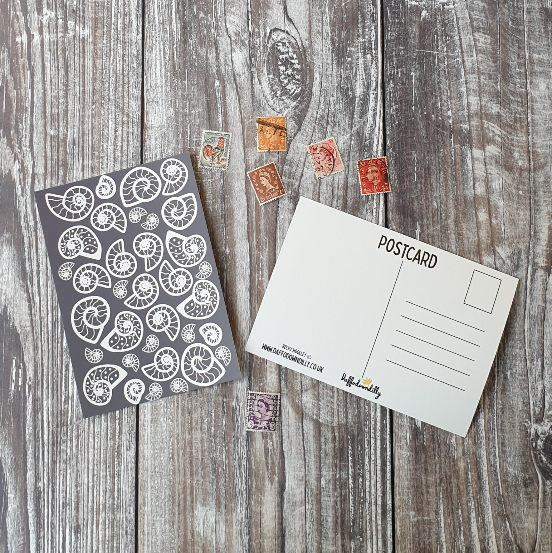 An ammonite inspired design perfect for seaside “wish you were here’s” for beach and fossil lovers.