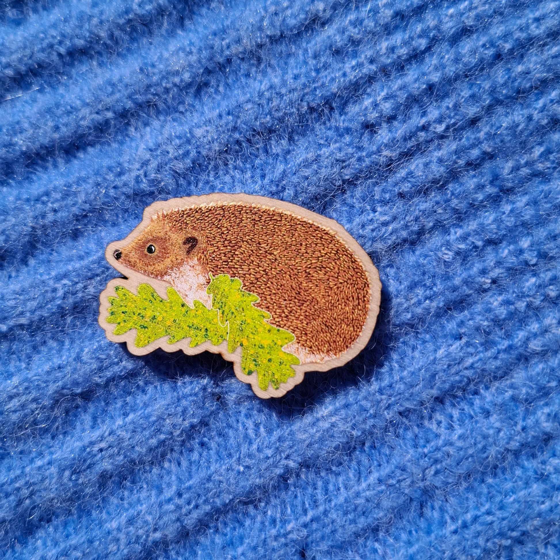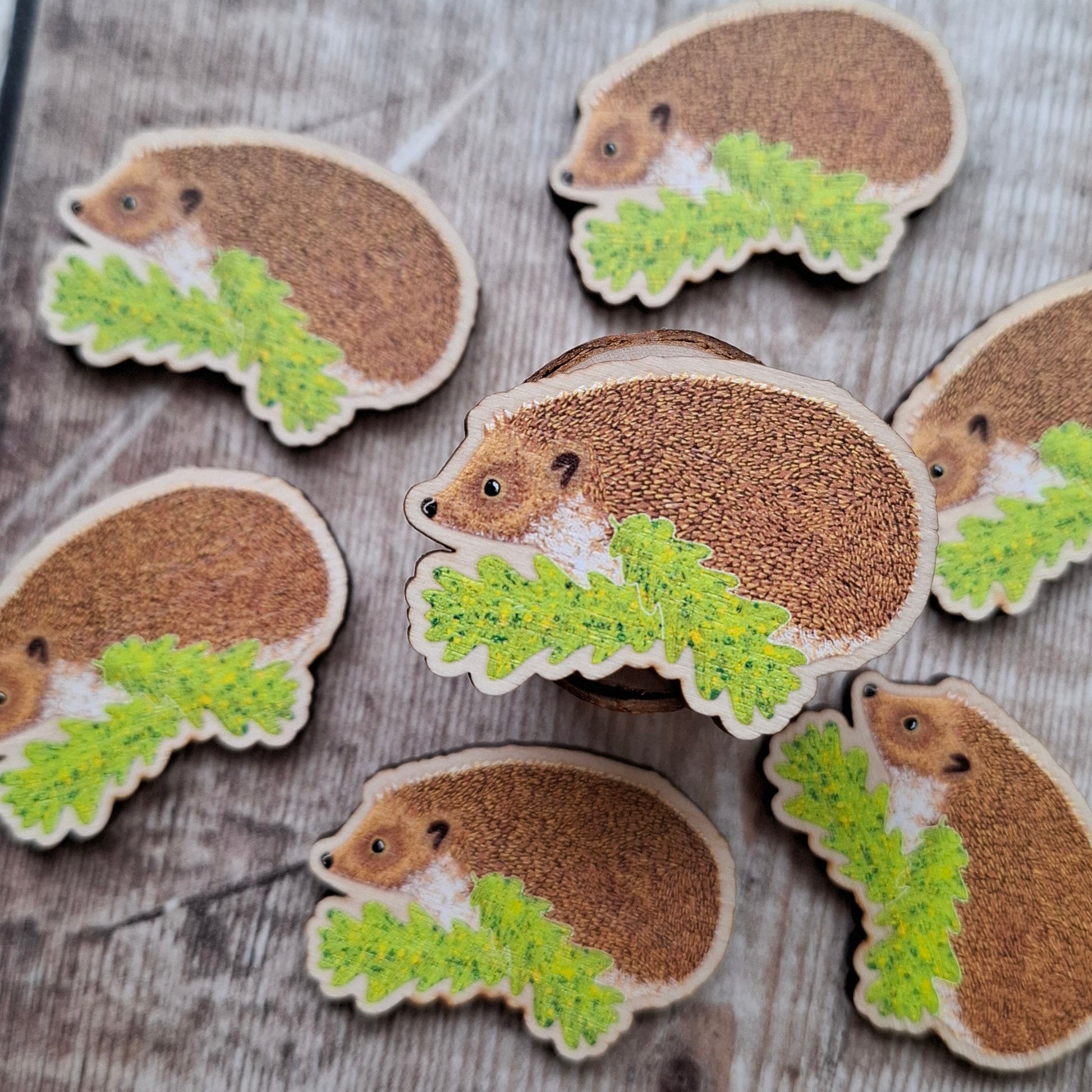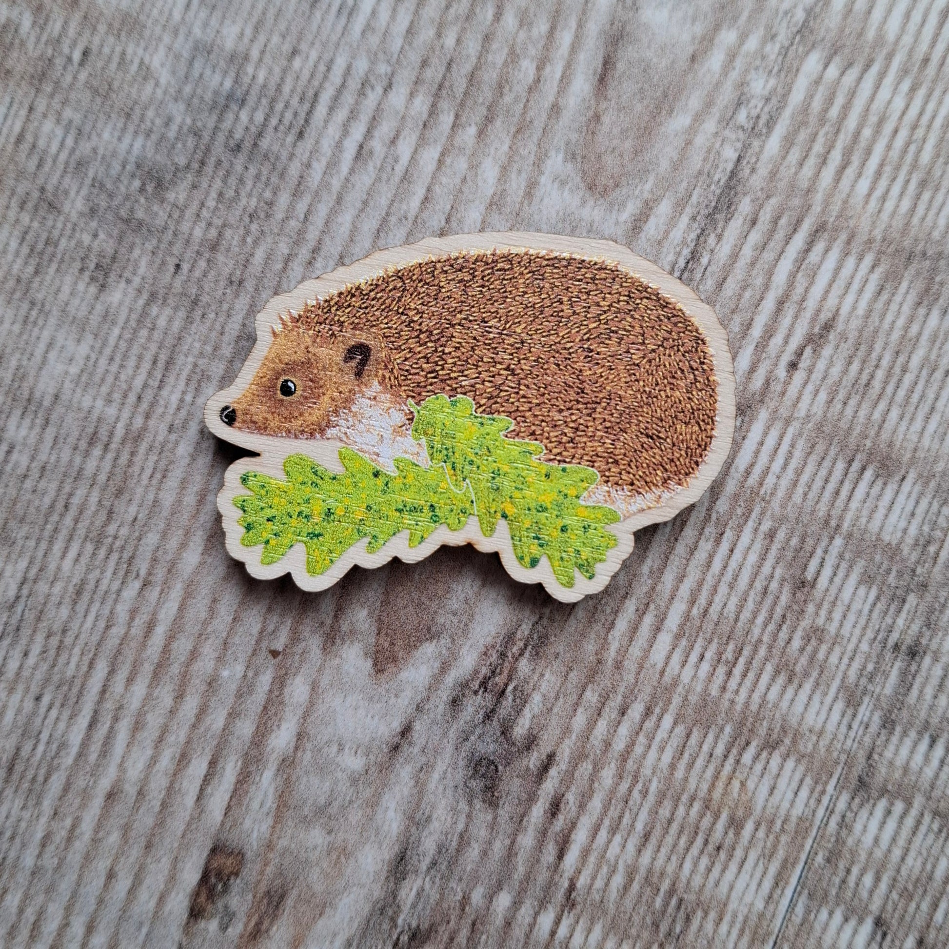 My hedgehog wooden pin has been made in Gloucestershire by a lovely company to my original design of a hedgehog rustling through oak leaves. I then attach the pin back and make it into a lapel pin.