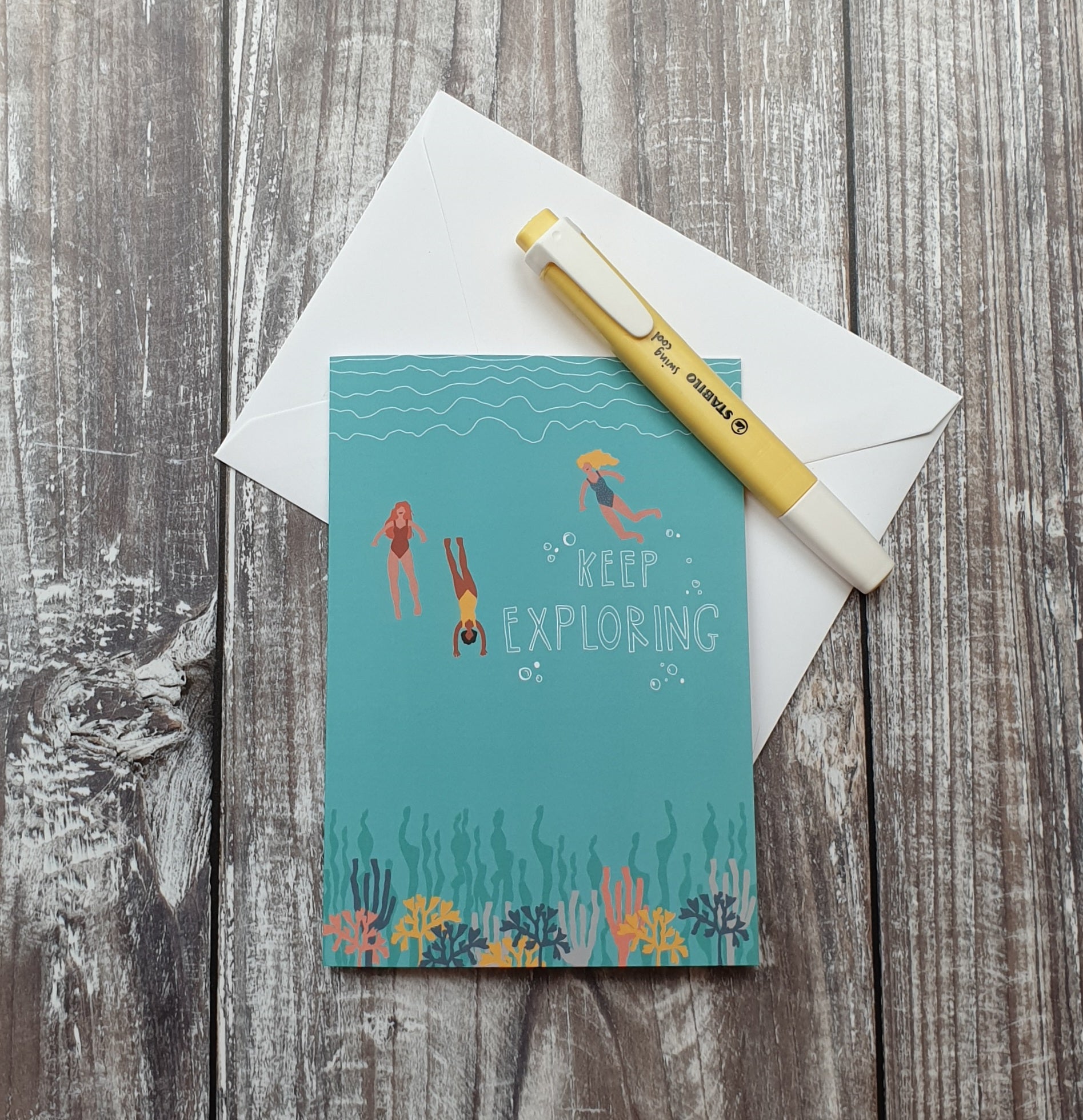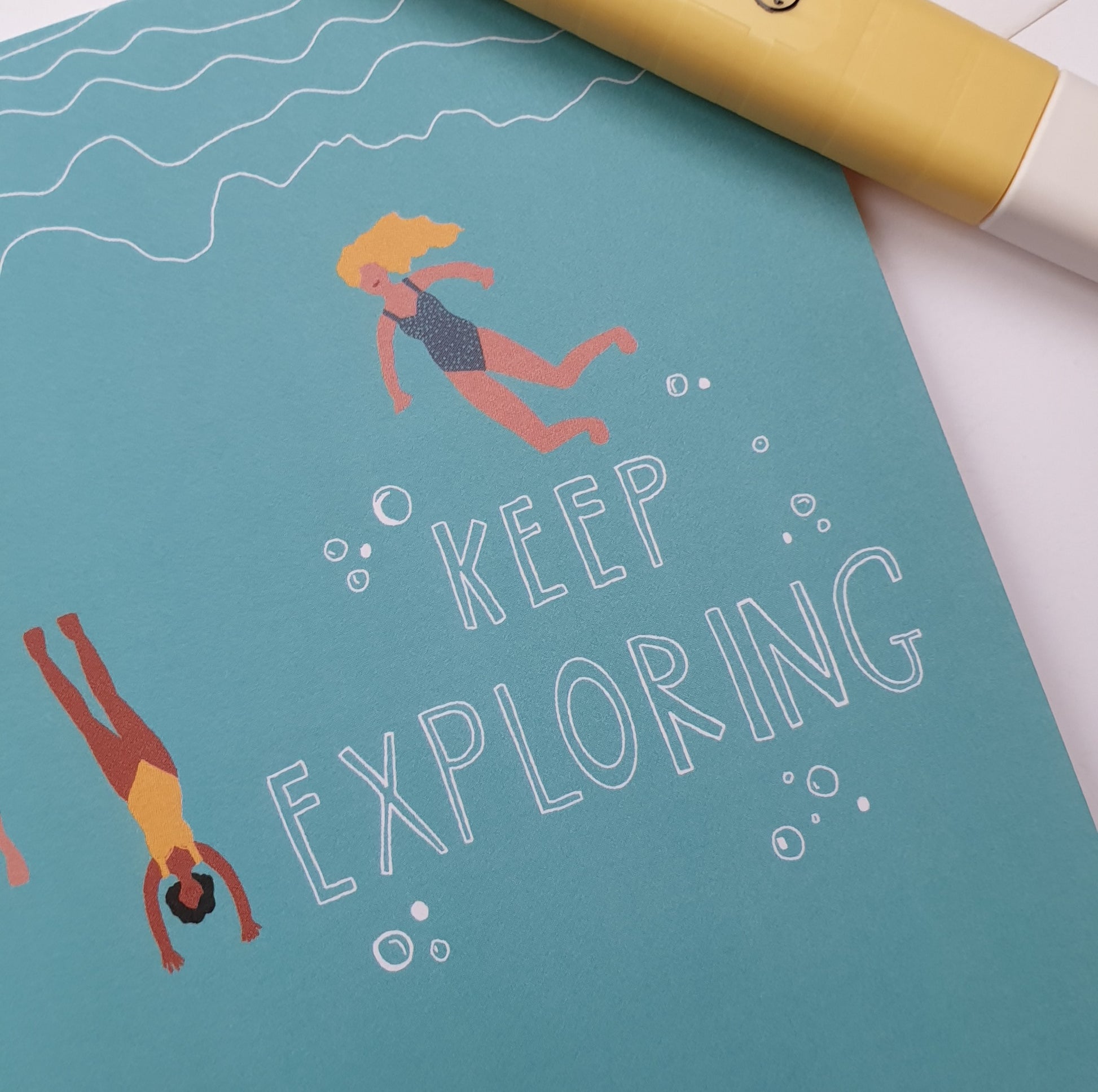 Keep Exploring - illustrated with 3 friends exploring a coral reef in beautiful turquoise waters.