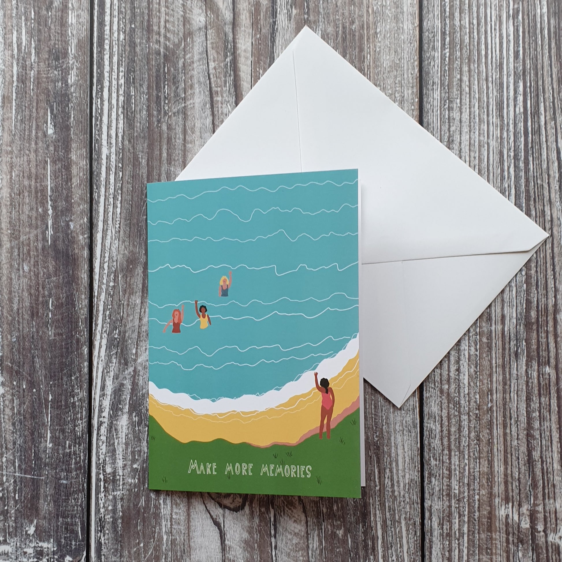Make More Memories - Illustrated with a group of friends enjoying a warm ocean swim in a beautiful cove.