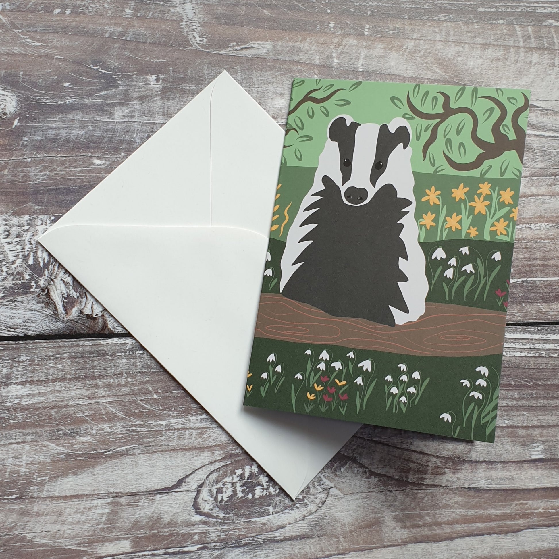 A cheerful woodland scene with Spring flowers and an inquisitive Badger.