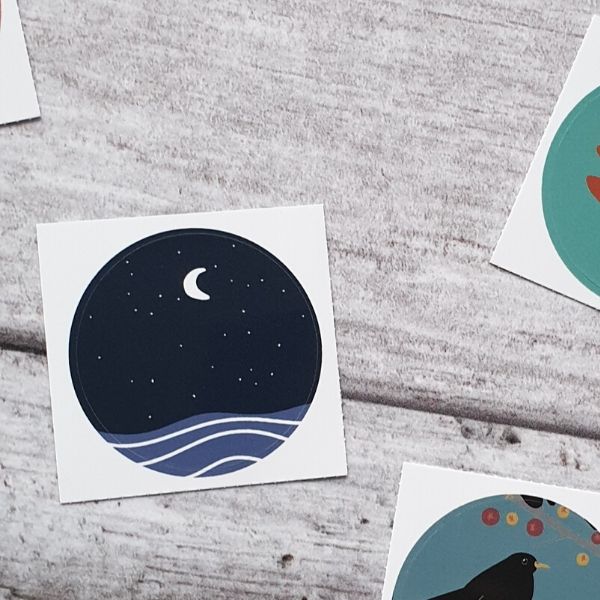 Gorgeously thick and shiny 38mm (3.8cm or 1.49 inches) round vinyl stickers, hand-designed by Daffodowndilly in Shropshire and printed in the UK.